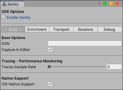 Sentry can be configured via the Sentry configuration window or programatically. The window can be accessed by going to Unity's top menu: Tools